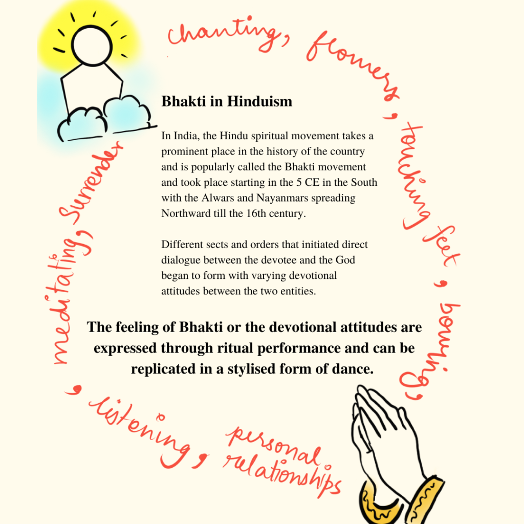 These forms of worship require repeated action and therefore have a performative element to them similar to dance, where one needs to be in continued practice with the art. This repetition can be called tapas or meditation. Being mindful of the body as a process to reach beyond the self is seen in both forms. The body represents the Saguna or the personified worship where both the bhaktin and God are represented through a body. The Nirguna is the divine consciousness of the ultimate that can be experienced. Through meditation, it is said that a bhaktin can experience this ultimate reality that is beyond themselves.